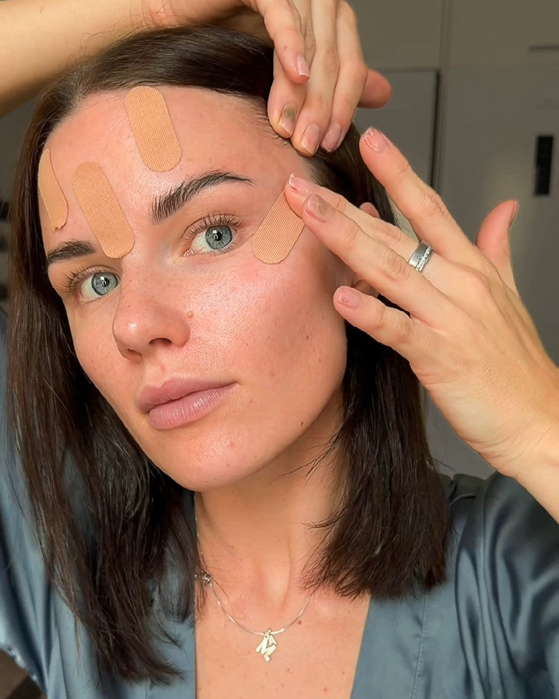 That’s it! In the morning, peel up one corner, then slowly roll the tape downwards. If it feels a bit stuck, dampen it with lukewarm water or a little face oil.